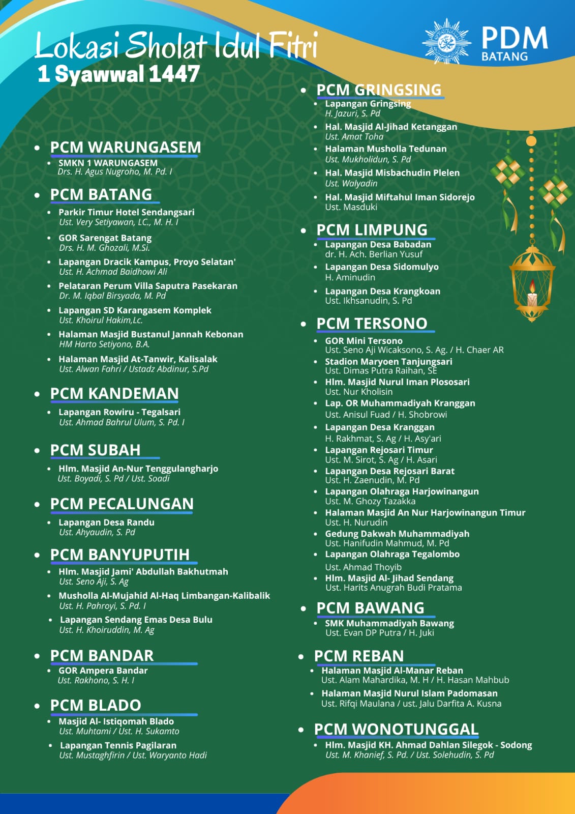 muhammadiyahpekalongan.or.id I Pekalongan – Umat muslim di Indonesia akan merayakan Idulfitri 1 Syawal 1447 H pada hari Jum’at, 20 Maret 2026. Berikut lokasi Sholat Idulfitri di wilayah Kabupaten Batang